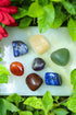 Amethyst, Sodalite, Lapis Lazuli, Green Aventurine/Jade, Golden Quartz, Carnalian, Red Jasper are Healing Crystals to energize & balance the 7 Chakras.