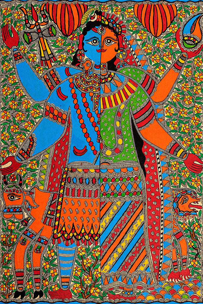 Symbol of love unity and power, the painting signifies the amalgamation of Lord Shiva and Goddess Parvati. This is an original Madhubani painting and is handpainted on handmade paper with bamboo pens and nibs. Mithila painting, popularly known as Madhubani Painting in modern times is world’s oldest art form.